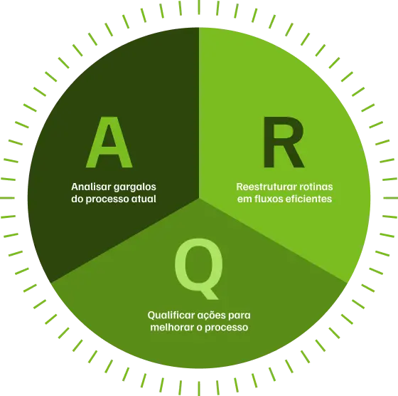 Baseado em três pilares essenciais – Analisar, Reestruturar e Qualificar, o Método ARQ identifica ineficiências, redefine fluxos de trabalho e implementa melhorias estratégicas para alcançar máxima performance operacional.